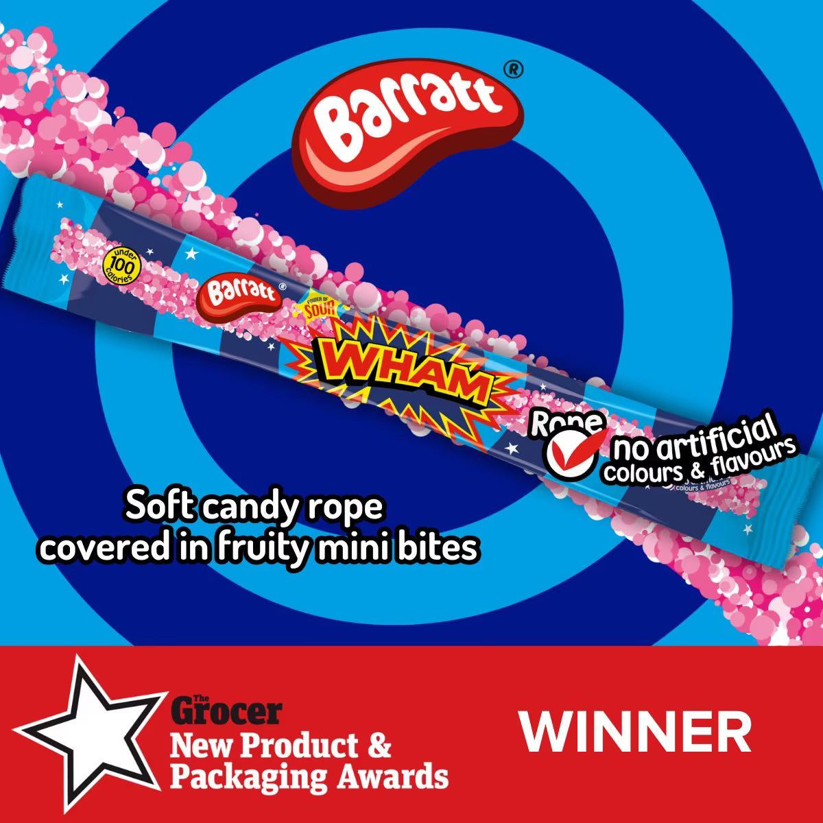 The iconic Wham has been transformed into something very special. It offers a delightful taste experience not to be missed with the classic fruity Wham sour raspberry flavour along with a fruity, crunchy mini sugar rock coating. It's a contemporary twist on a nostalgic treat, made without artificial flavours or colours, and each rope has under 100 calories, perfect for guilt-free snacking. With Wham ranking higlly with UK sweet consumers, these inventive jelly ropes are poised to become a cherished part of your Barratt selection, promising to be popular with customers. Plus, this unique take on a classic is an award-winner, recently taking Silver at The Grocer New Product and Packaging Awards. It’s a no-brainer to stock up and get customers hooked on the experience of a Wham Rope!